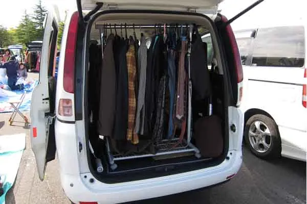 ~最初はハンガーラックを外に置いていたが、強風のため何度も倒れるので車の中に~