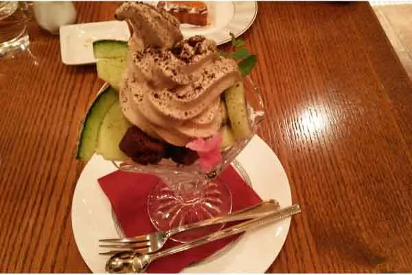 牛乳アイスのほかにブラウニー、チョコクランチ、生フルーツものっている贅沢なパフェです。