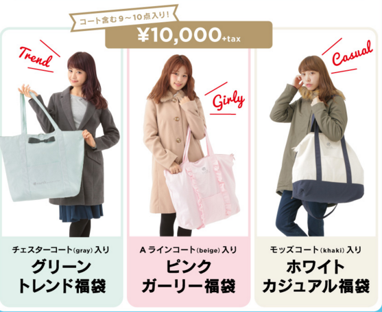 福袋の中身は、レディース福袋AとB・キッズ福袋の3点。