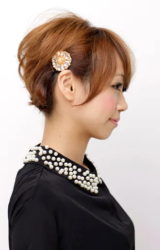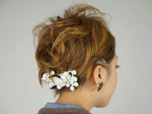 ワックスと逆毛の合わせ技で、スタイルを楽しんで。髪飾りを下のほうにつけると、うなじの綺麗さが強調されます。