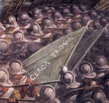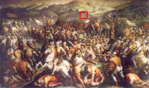 ” これがダ・ヴィンチの壁画の上に描かれたとされる、ヴァザーリの「The Battle of Marciano in the Chiana Valley」。赤で囲まれた部分に描かれた軍旗に、ヴァザーリからのメッセージだと考えられる言葉があります。 “(正直、細かくて良く見えませんね)