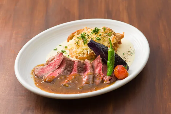 やわらかく食べ応えのある肉質が特長の葡萄牛に和風ガーリックソースをかけたパンチのあるステーキと、香草とともに漬け込みパン粉とチーズをのせて焼き上げた「皮パリ・中ジュワ」がやみつきになるチキン。