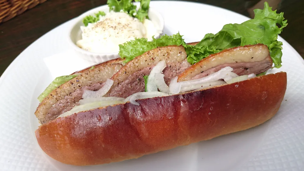 自慢の鴨肉のスモークを挟んだホットドッグは絶品!!