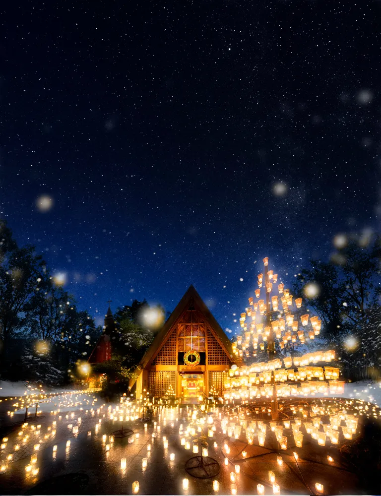 クリスマスは教会前に高さ6mのツリーが飾られ、イルミネーションと無数のキャンドルの灯りに包まれます。そして教会の森の中央には、光の十字路が幻想的に輝きます。
