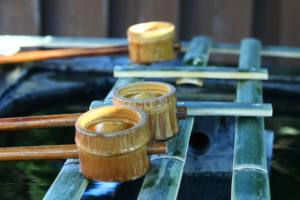 神社に行くと、水場に柄杓が置いてある場所があります。ここを手水舎(てみずや)と言います。通常、ここで簡易的なお清めをしてから参拝するのが作法です。