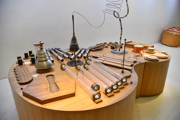 上に乗っているのはぜんぶ楽器なんです!形も素材も、音の鳴らし方も様々な楽器たち。