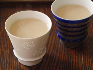 最後はこちら。抹茶入りの珍しい甘酒。抹茶が甘酒を邪魔していないので、違和感なく飲めます。抹茶ラテなどが好きな人は、そんな感覚で飲めると思います。