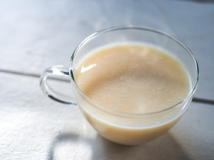 私の場合、酒粕を使ったはちみつ甘酒を作ることが多いのですが、作ってボトルに入れ、冷蔵庫で冷やしておき、飲むときには低脂肪乳で割って飲んでいます。まろやかになって飲みやすいです。酒粕の粒感も楽しいです。