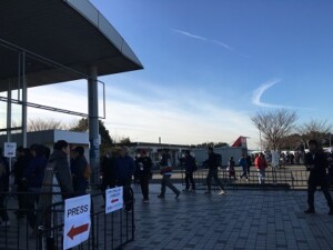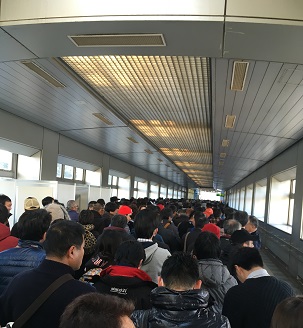 とにもかくにも前の人の後にくっついて歩くしかないです。常連たちの声によると、去年より混んでいるとのこと。開場前でこの列の長さはヤバイという事らしいですよ。