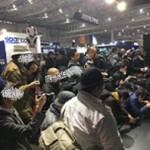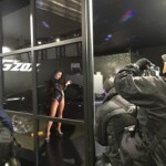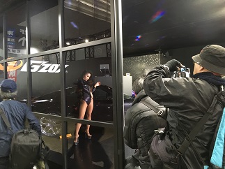 どのようなブースかわからないけれど、とにかく床低くカメラを構える男性たち。もしかしてと思って近寄ると…挑発的なポーズのお姉さん。