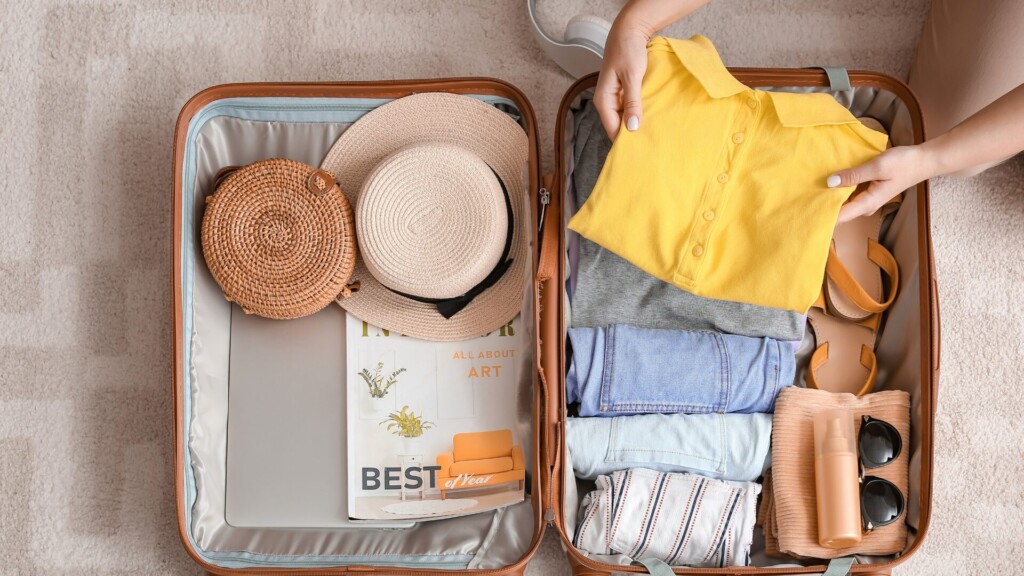 カバンやスーツケースの中で重いものを下、軽いものを上に配置すると移動中の持ち運びがラクになります。