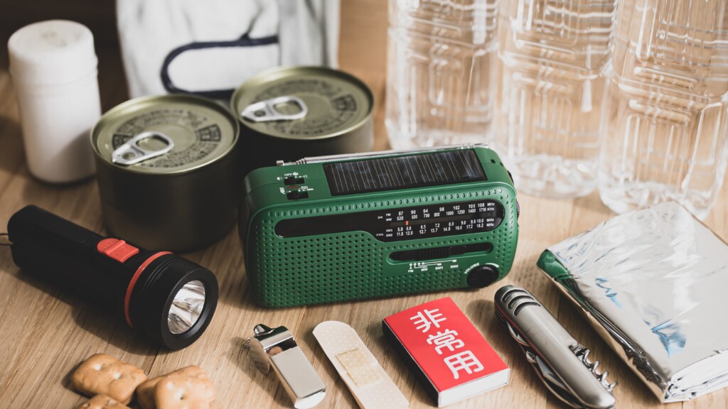 懐中電灯、携帯充電器、簡易トイレなど、最低限の防災グッズを準備しましょう。