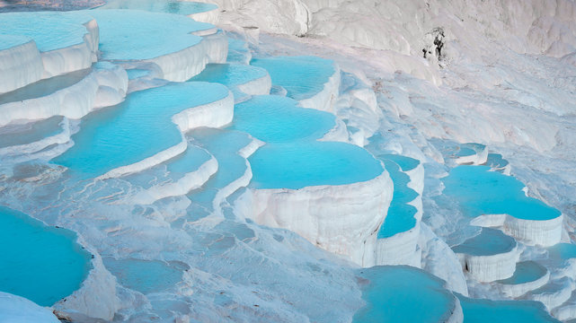 「綿の城」とも呼ばれるパムッカレは、真っ白な石灰棚が広がる絶景スポット。青白い温泉水が溜まる美しい景色を楽しみながら、リラックスした時間を過ごせます。